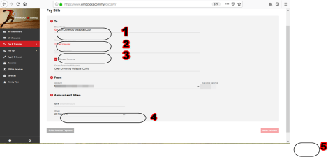 - Okay. Kali ni.. tuan tuan dan puan puan perlu pergi ke Biller Name dan taip Open University Malaysia (OUM). Masukkan IC pelajar dan No h/p. Masukkan jumlah amaun yang hendak dibayar. Setelah itu, klik “Make Payment”.
